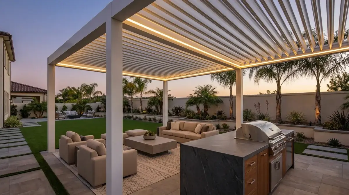 A modern, light-colored aluminum louvered pergola covering a sleek outdoor dining area with comfortable chairs and lush green landscaping in an Orange County backyard.